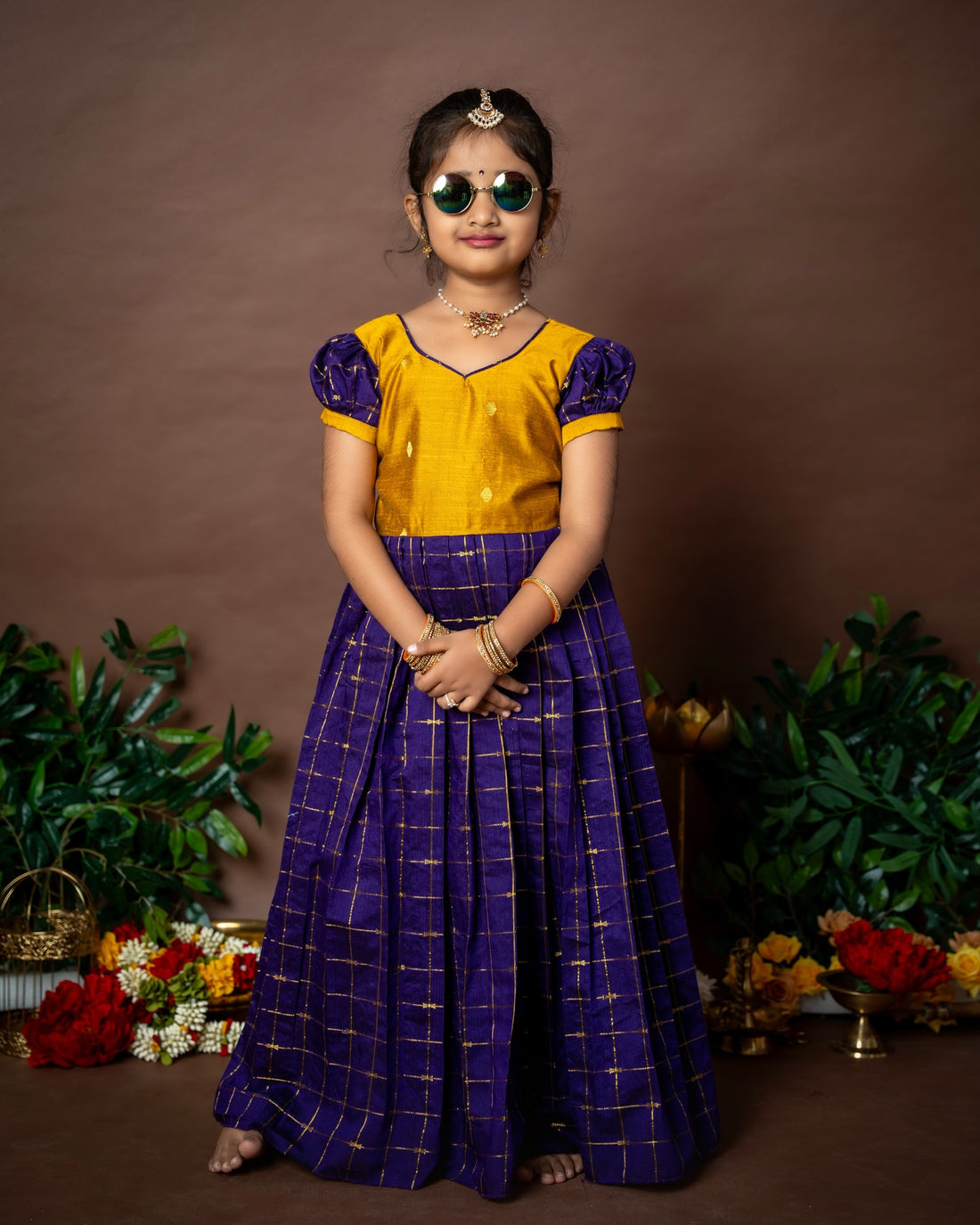 Lilac Skirt–Top set paired with a contrast Purple Thavani