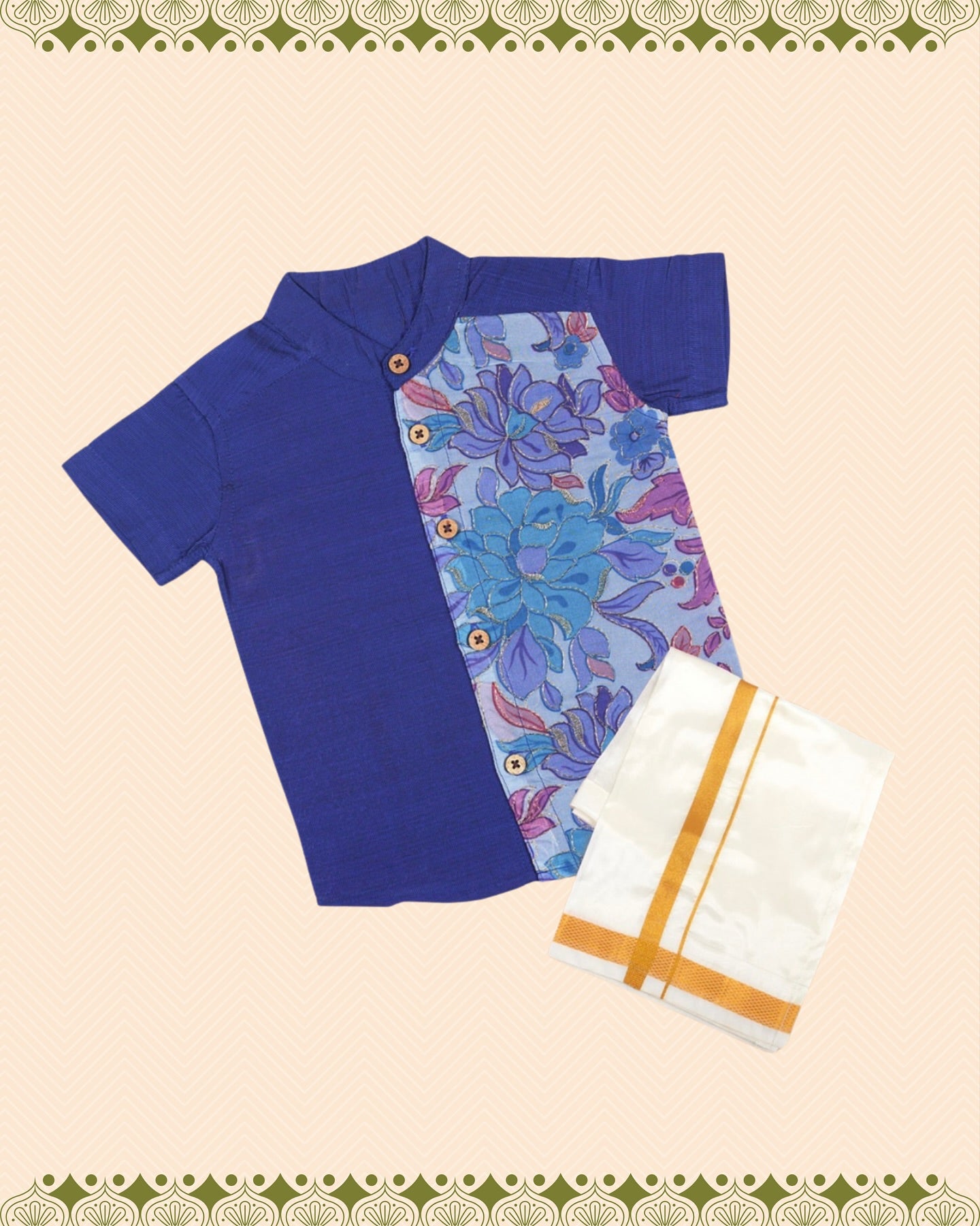 Blue Floral Panel Silk shirt with Pattu Vesti set for Boys