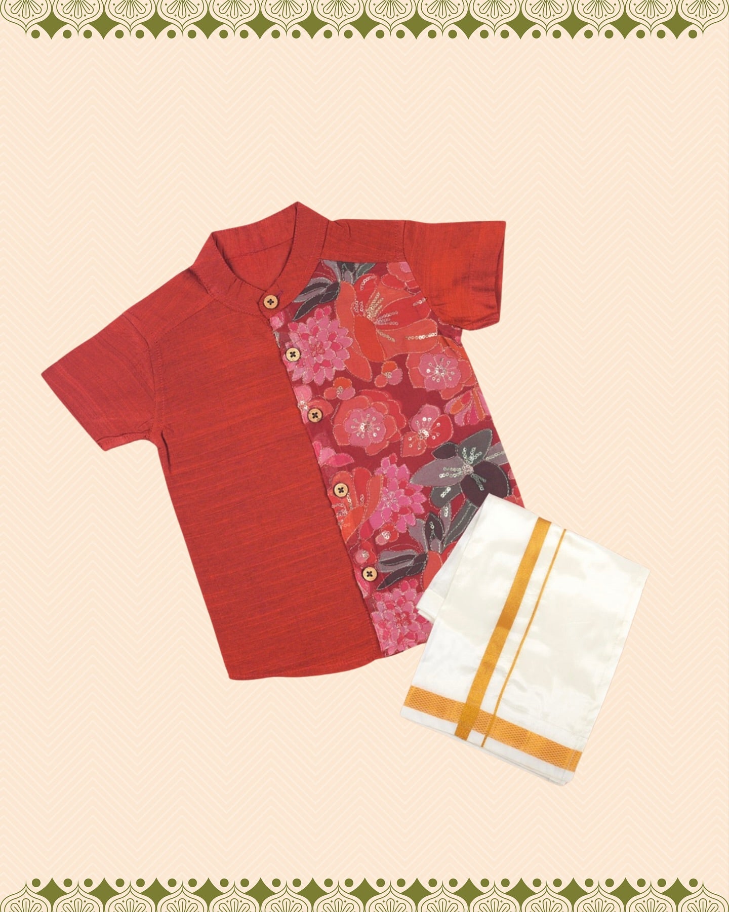 Brick Red Floral Panel Silk shirt with Pattu Vesti set for Boys