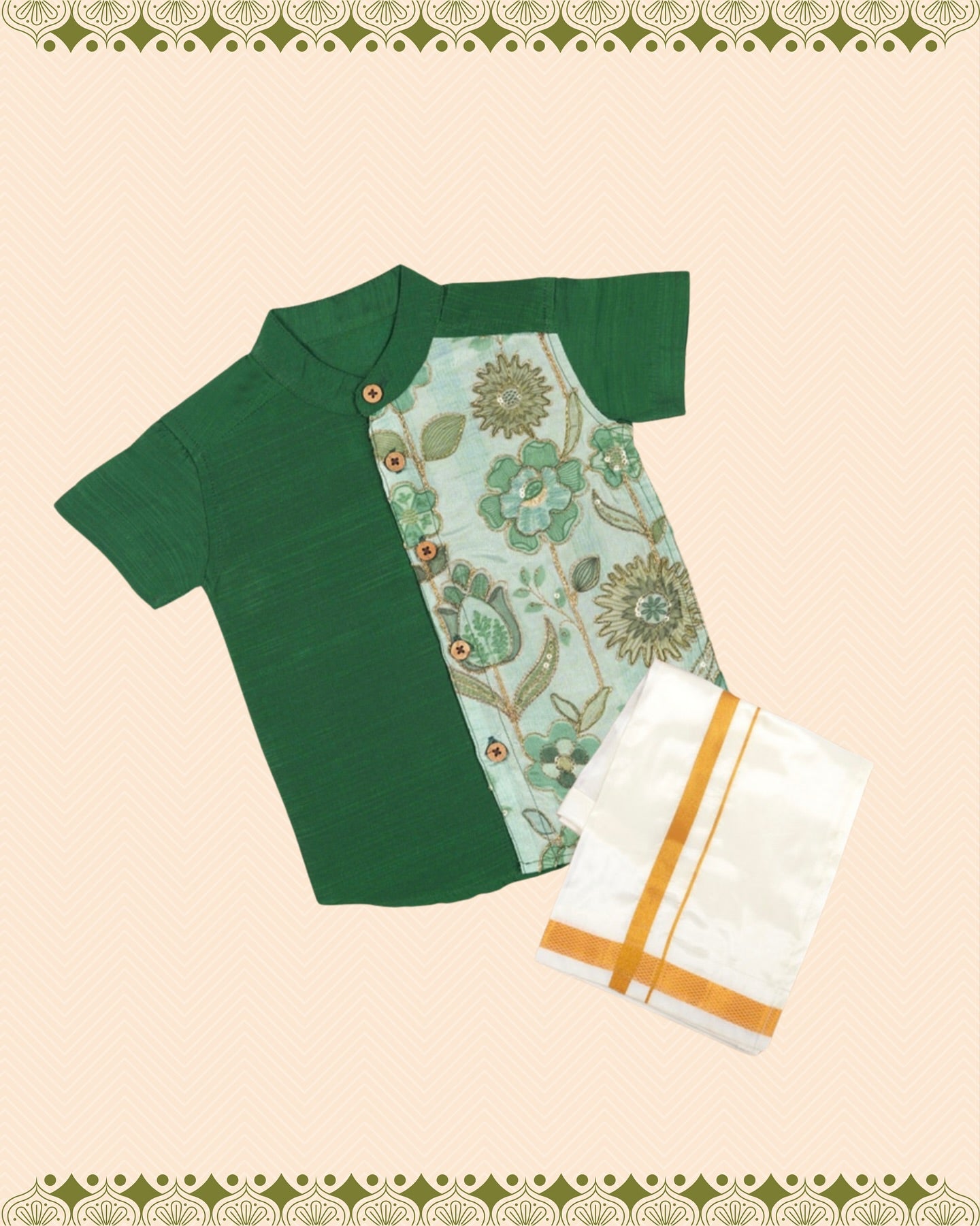 Dark Green Floral Panel Silk shirt with Pattu Vesti set for Boys