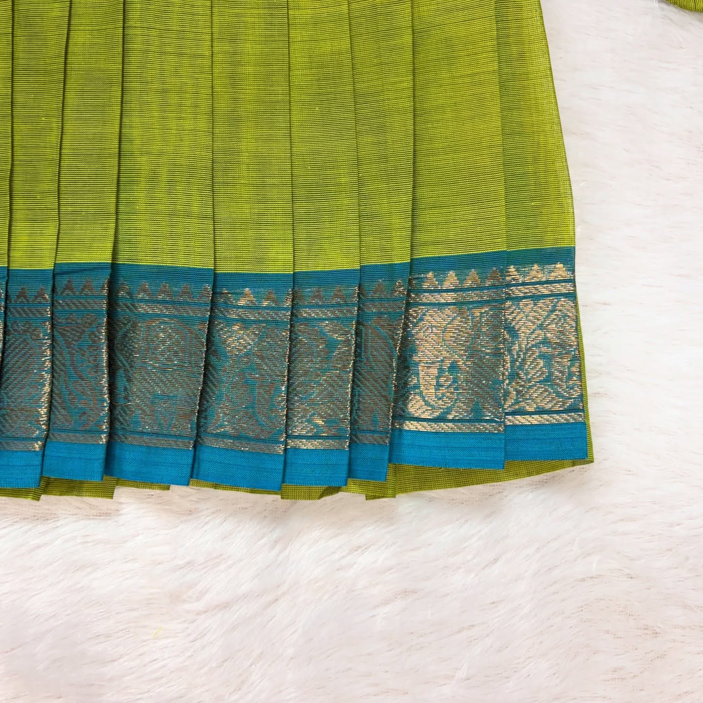 Light Green with Light Blue - Traditional Kanchi Cotton Kids Ethnic Midi Length Frock