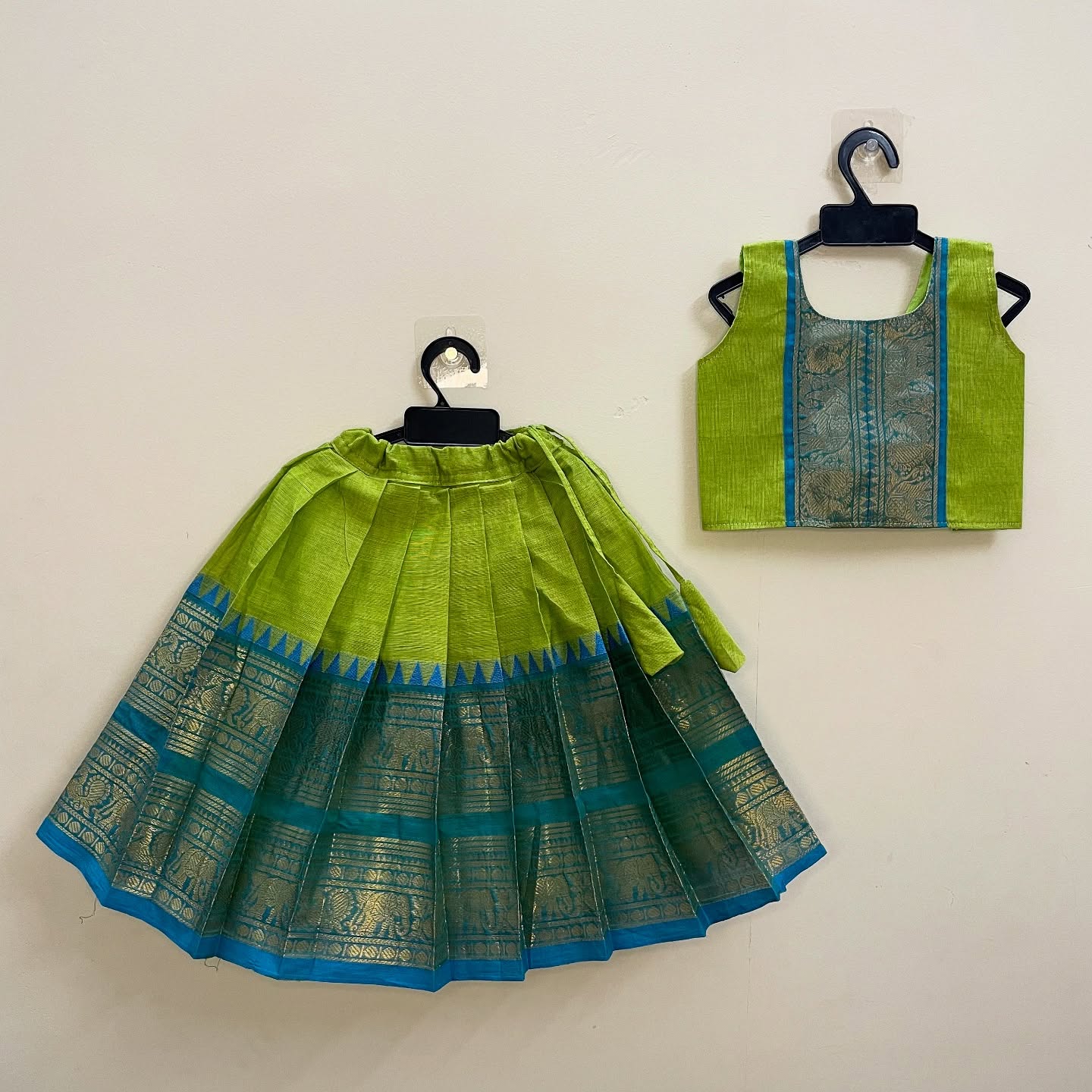 Mayura Authentic Kanchi cotton Paavadai Sattai with traditional zari border – Light Green and Light Blue Border